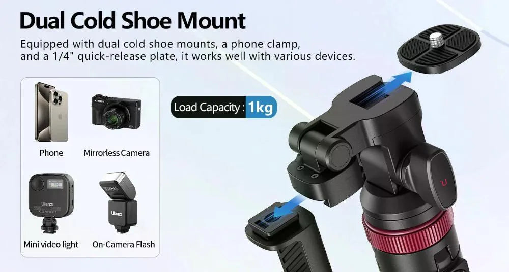 - Incluye una placa de liberación rápida de 1/4″, compatible con teléfonos, cámaras sin espejo, luces de video y flashes.